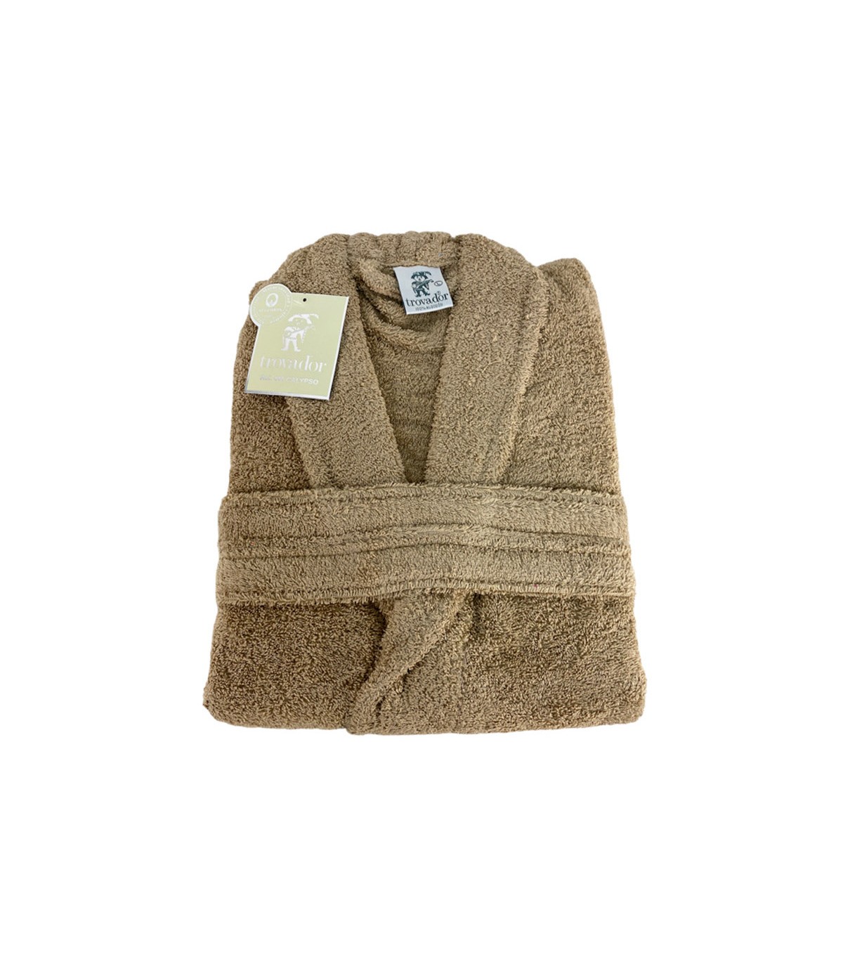 Albornoz Unisex (para caballero y señora), modelo Calypso de la marca TROVADOR. Tiene cuello smoking con, dos bolsillos y cinturón para ajustar a la cintura.  Tejido con un alto poder de absorción y tacto extra suave.