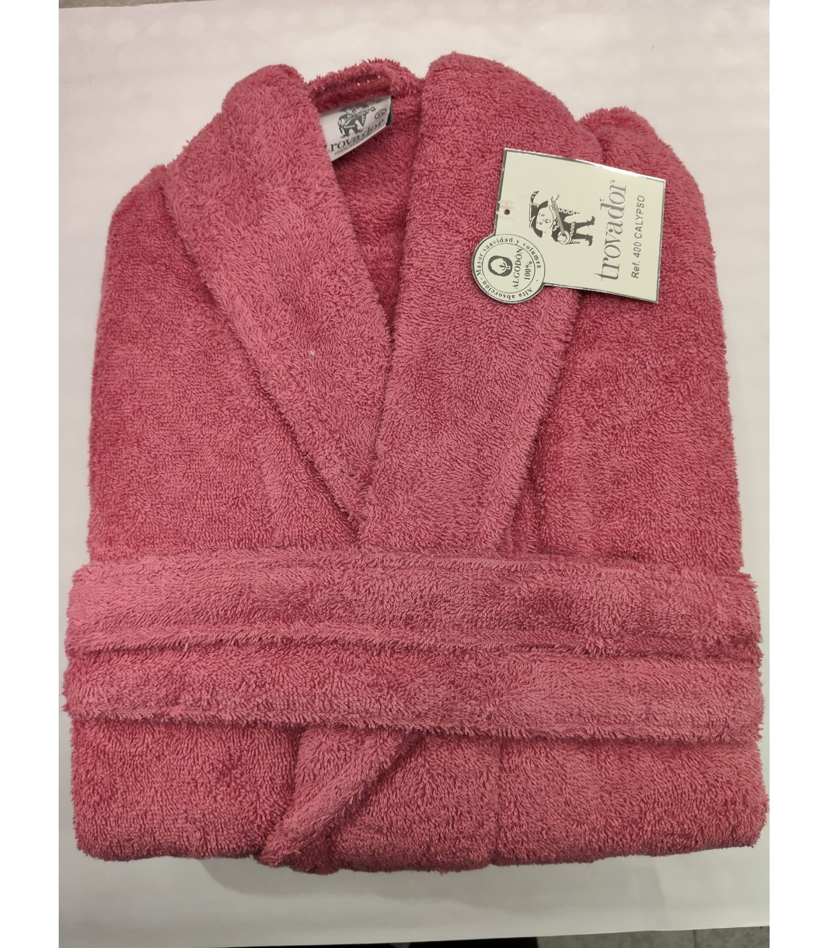 Albornoz Unisex (para caballero y señora), modelo Calypso de la marca TROVADOR. Tiene cuello smoking con, dos bolsillos y cinturón para ajustar a la cintura. Tejido con un alto poder de absorción y tacto extra suave.