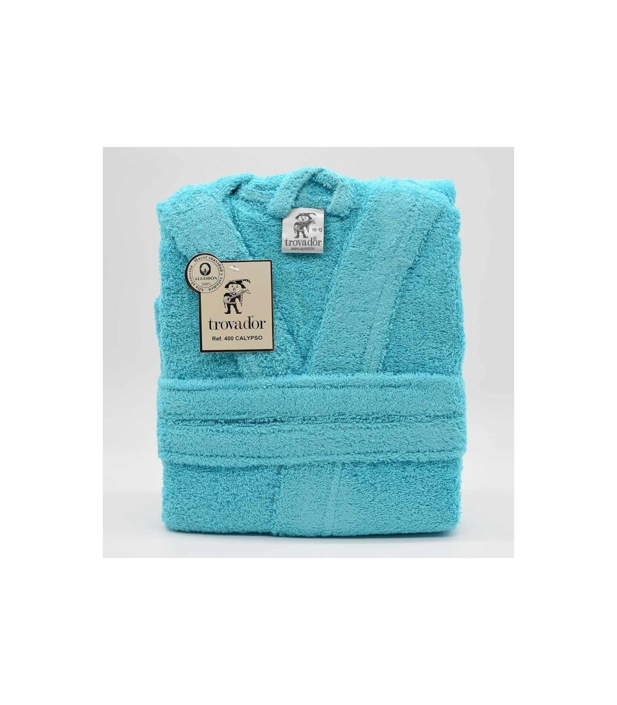 Albornoz para niño con capucha, modelo Calypso de la marca TROVADOR.  Tiene cuello smoking con capucha, dos bolsillos y cinturón para ajustar a la cintura.  Tejido con un alto poder de absorción y tacto extra suave.
