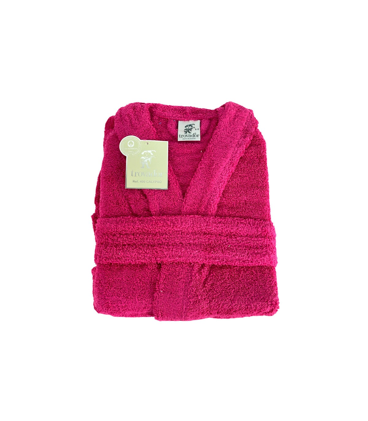 Albornoz para niño con capucha, modelo Calypso de la marca TROVADOR.  Tiene cuello smoking con capucha, dos bolsillos y cinturón para ajustar a la cintura.  Tejido con un alto poder de absorción y tacto extra suave.