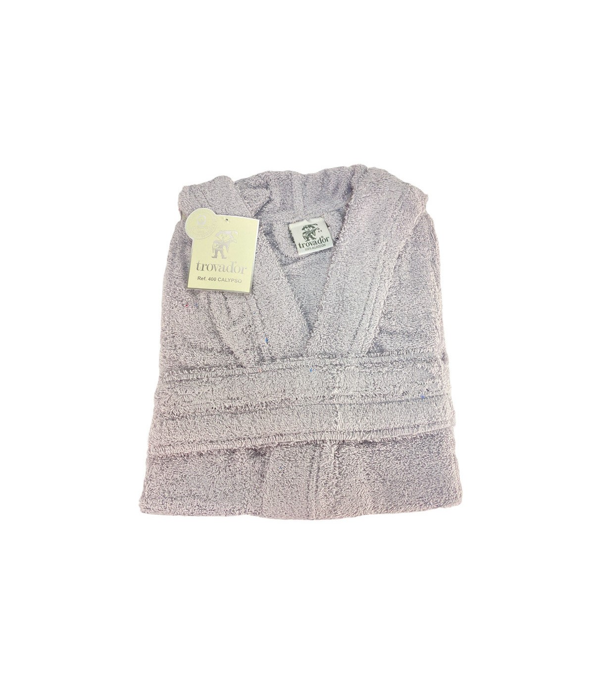 Albornoz para niño con capucha, modelo Calypso de la marca TROVADOR.  Tiene cuello smoking con capucha, dos bolsillos y cinturón para ajustar a la cintura.  Tejido con un alto poder de absorción y tacto extra suave.
