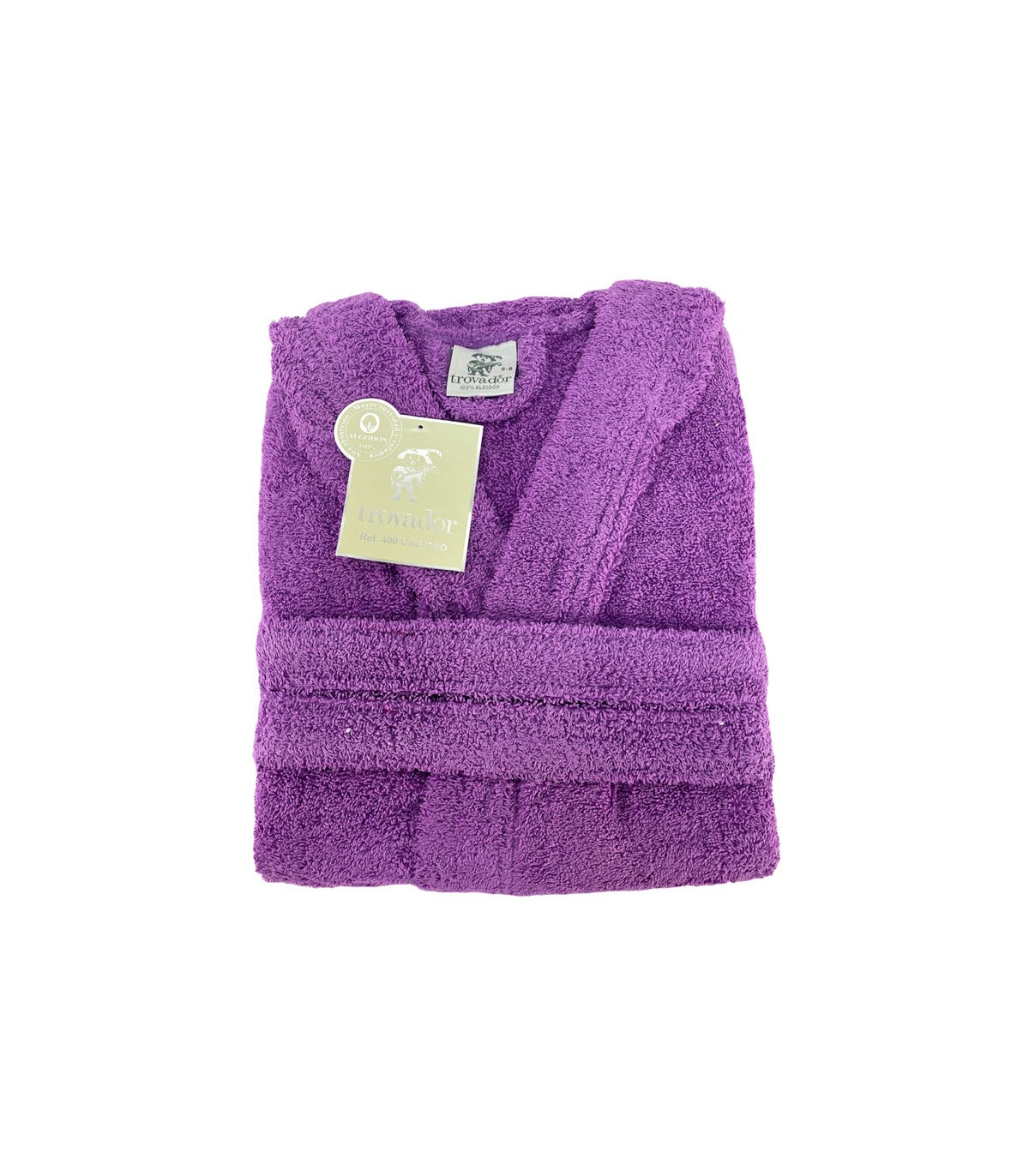 Albornoz para niño con capucha, modelo Calypso de la marca TROVADOR.  Tiene cuello smoking con capucha, dos bolsillos y cinturón para ajustar a la cintura.  Tejido con un alto poder de absorción y tacto extra suave.