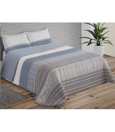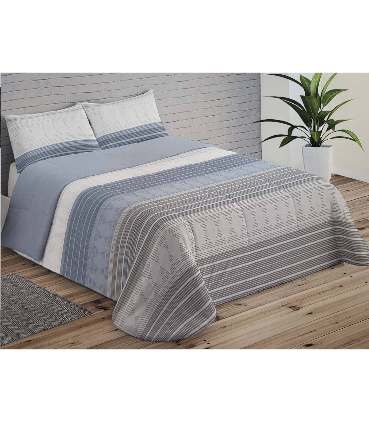 Edredón Sherpa modelo ARAN de la línea Trovador. Este edredón destaca por su suavidad y calidez, que lo hace ideal para los meses de invierno, tiene un diseño geométrico en en tonos grises y azules de nacarina por una cara y por la parte interna de borreguito tintado.