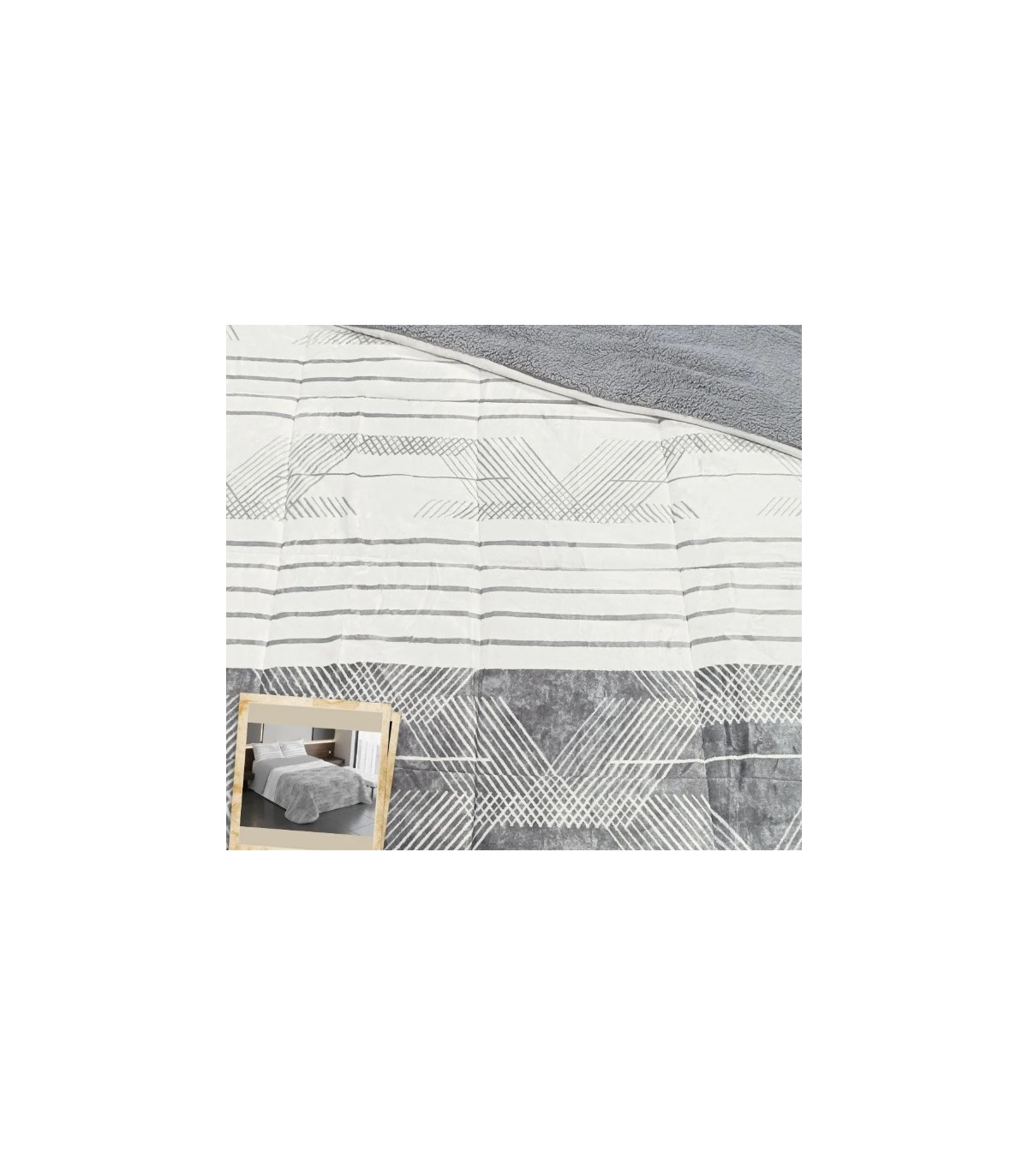 Edredón Sherpa modelo URBE de la línea Trovador. Este edredón destaca por su suavidad y calidez, que lo hace ideal para los meses de invierno, tiene un diseño geométrico en en tonos gris y azules de nacarina por una cara y por la parte interna de borreguito tintado.