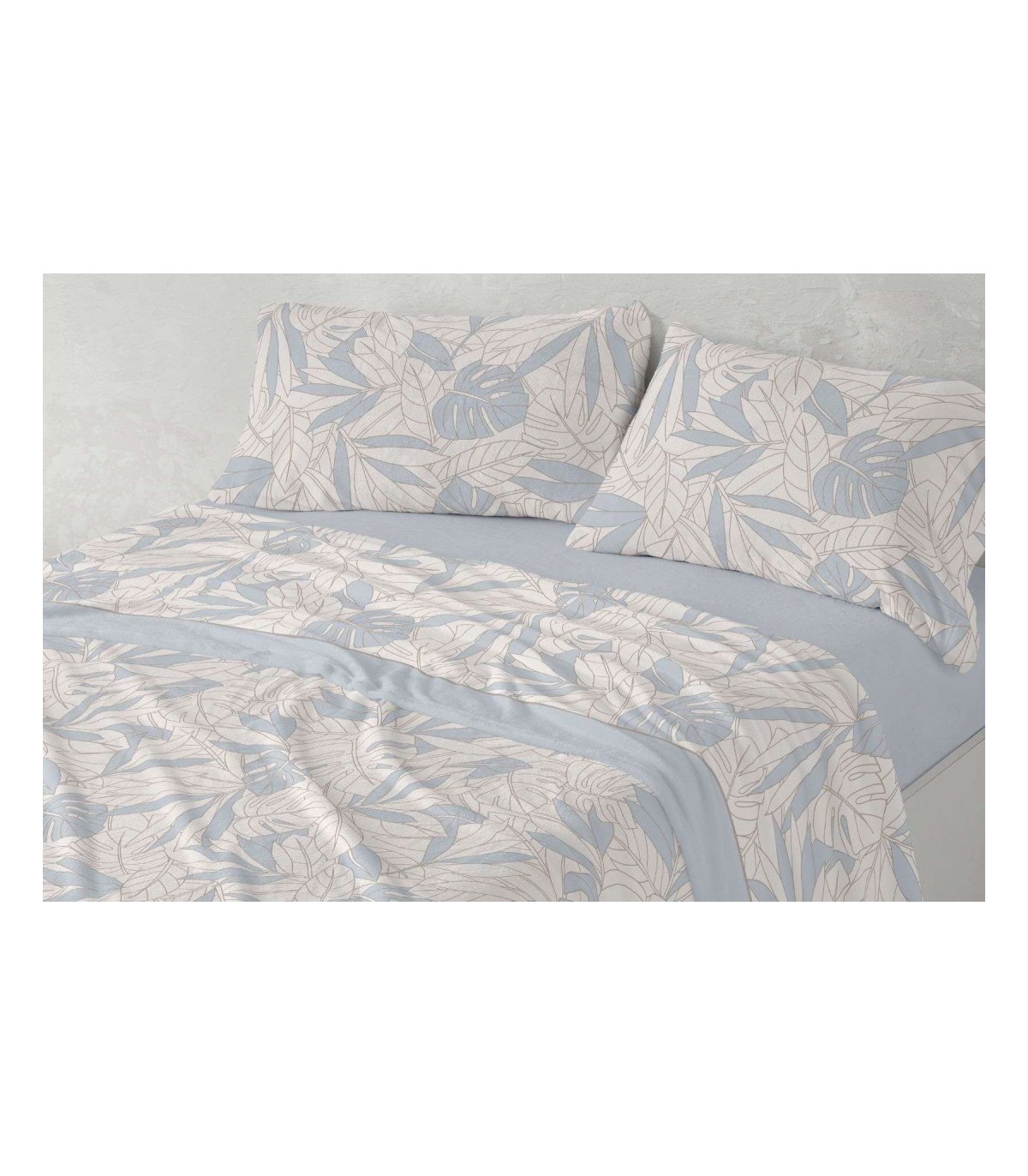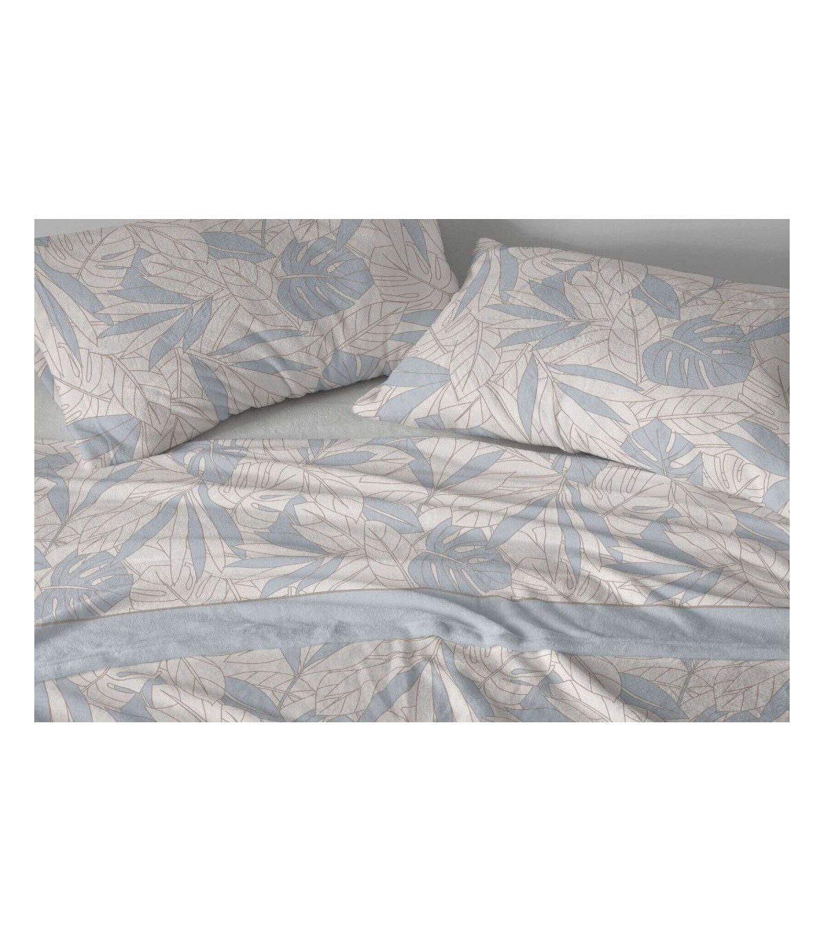 Juego de Sábanas de Coralina diseño 994 de la marca Burrito Blanco. Sábanas de invierno confeccionado con tejido CORALINA, cálido y extremadamente suave y ligero, destacan por su gran calidad, garantizando una gran durabilidad, con un diseño de hojas tropicales superpuestas.