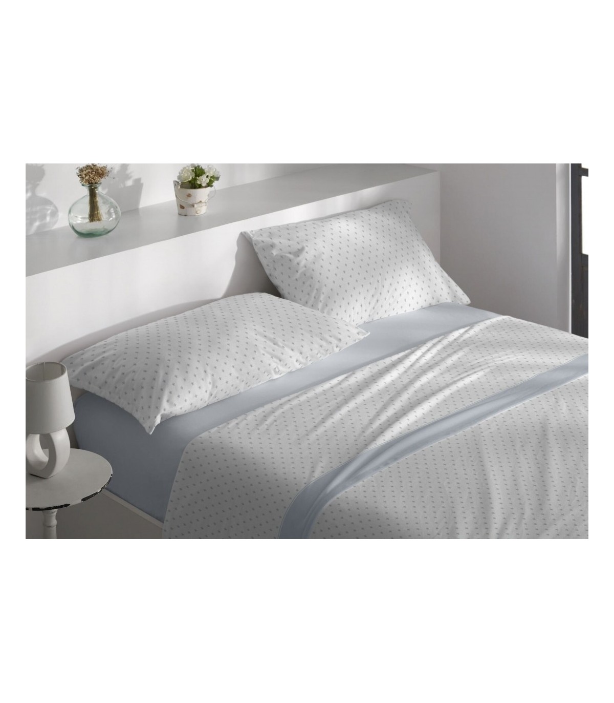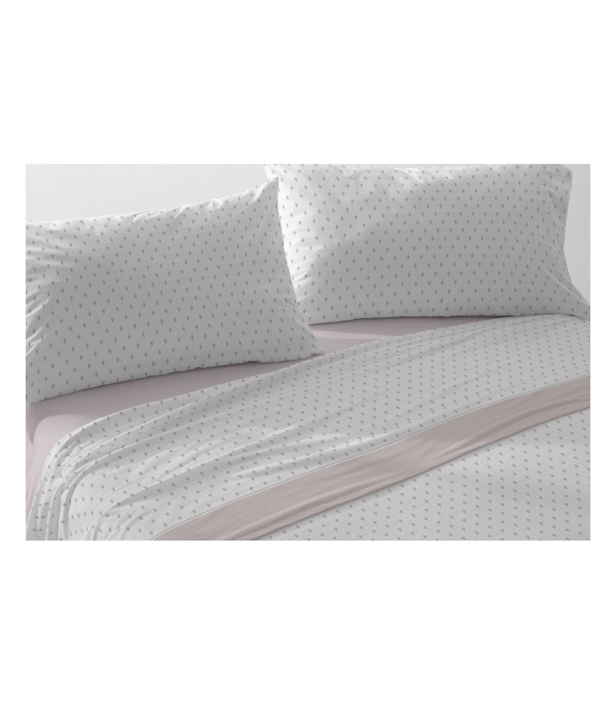 Juego de sábanas de tejido Velvelina modelo 10 de la marca Burrito Blanco. Las sábanas de Velvelina, destacan por una suavidad derivada del perchado a doble cara, agradable y textura aterciopelada, con el pelo más corito que las sábanas de coralina. Juego con estampado clásico atemporal con pequeñas flores de lis.