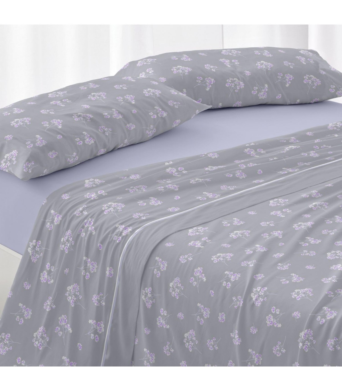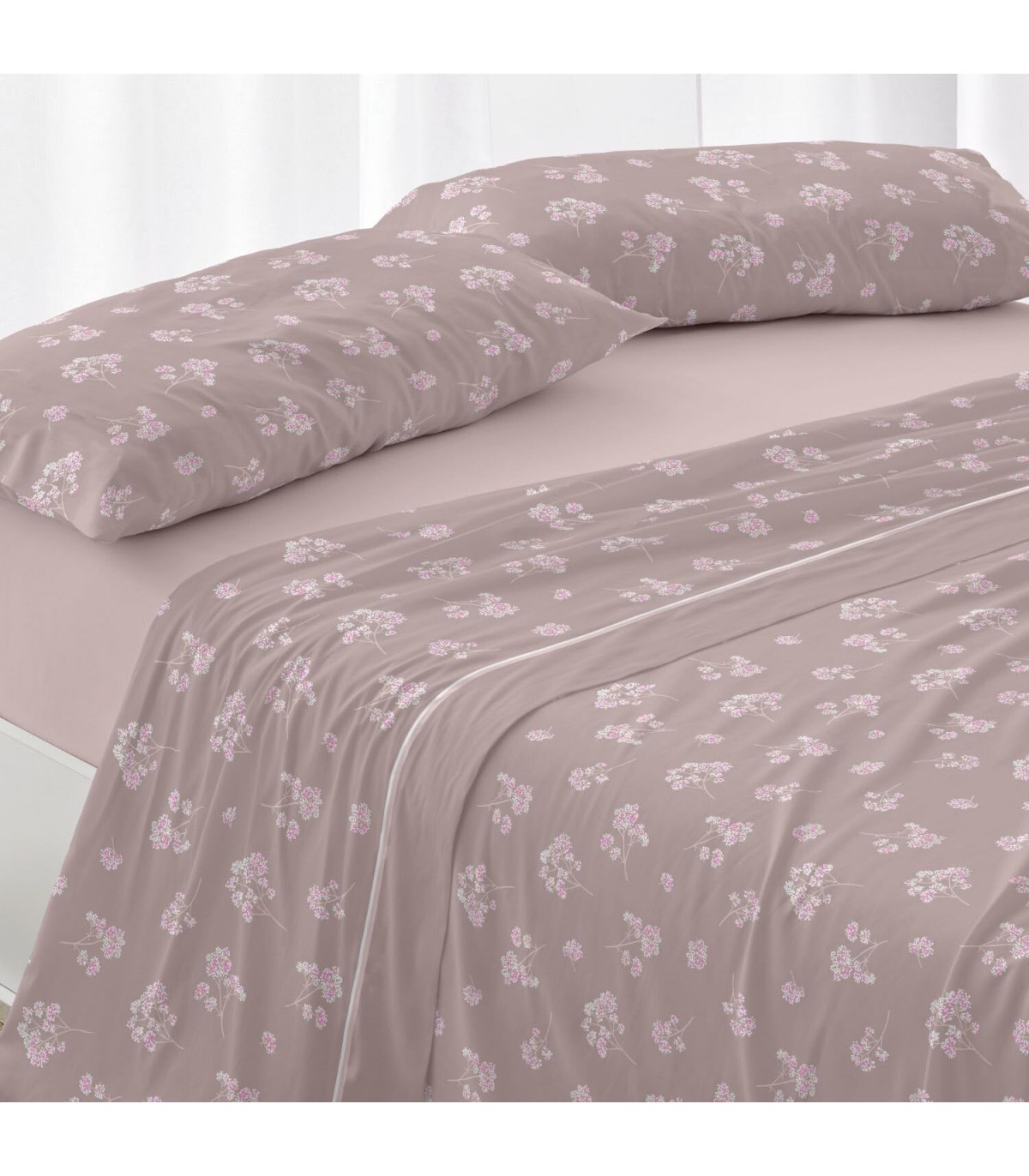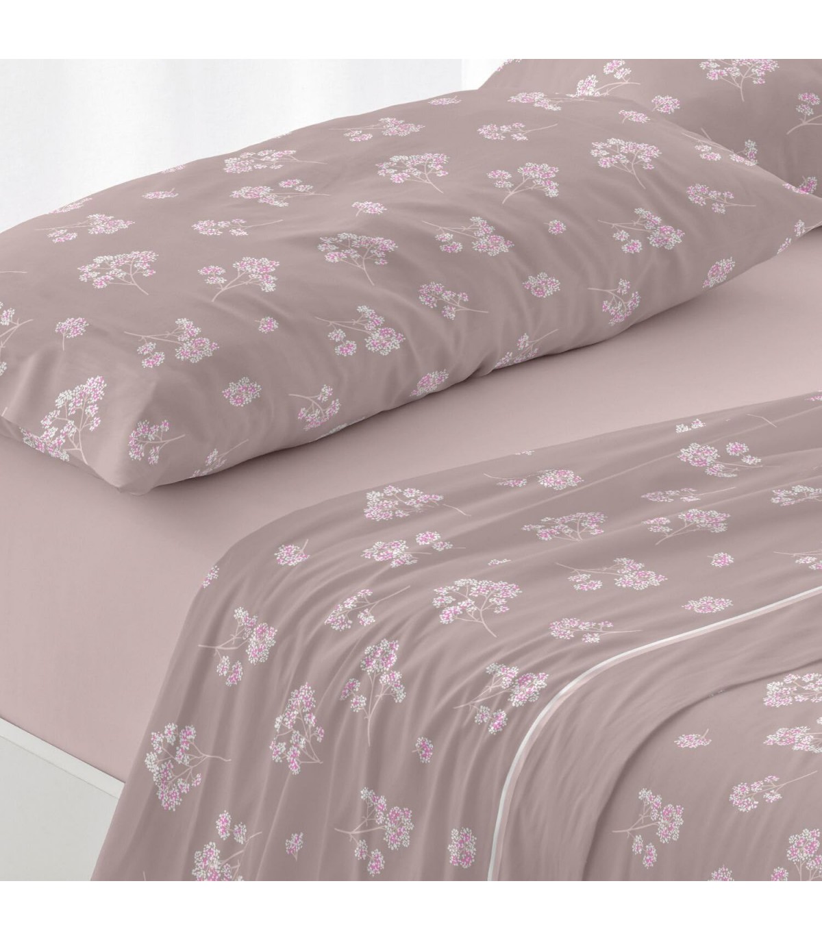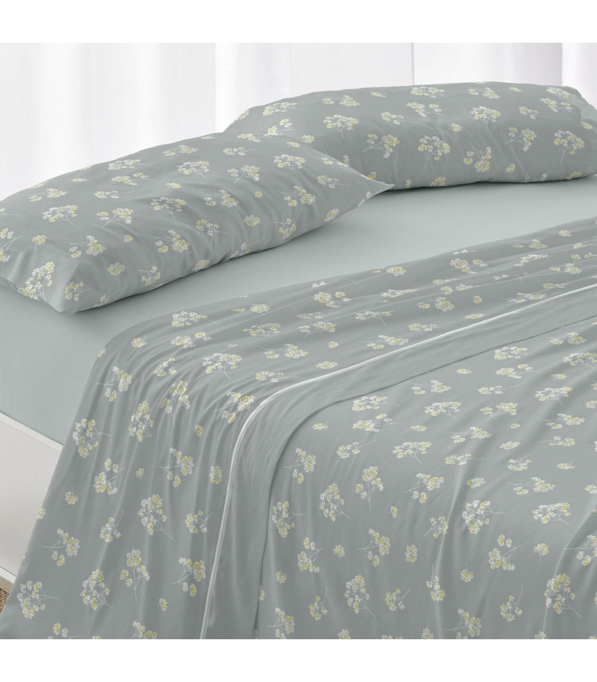 Juego de sábanas de tejido Velvelina modelo 06 de la marca Burrito Blanco. Las sábanas de Velvelina, destacan por una suavidad derivada del perchado a doble cara, agradable y textura aterciopelada, con el pelo más corito que las sábanas de coralina. Juego con estampado de mimosas en color blanco sobre fondo de color.