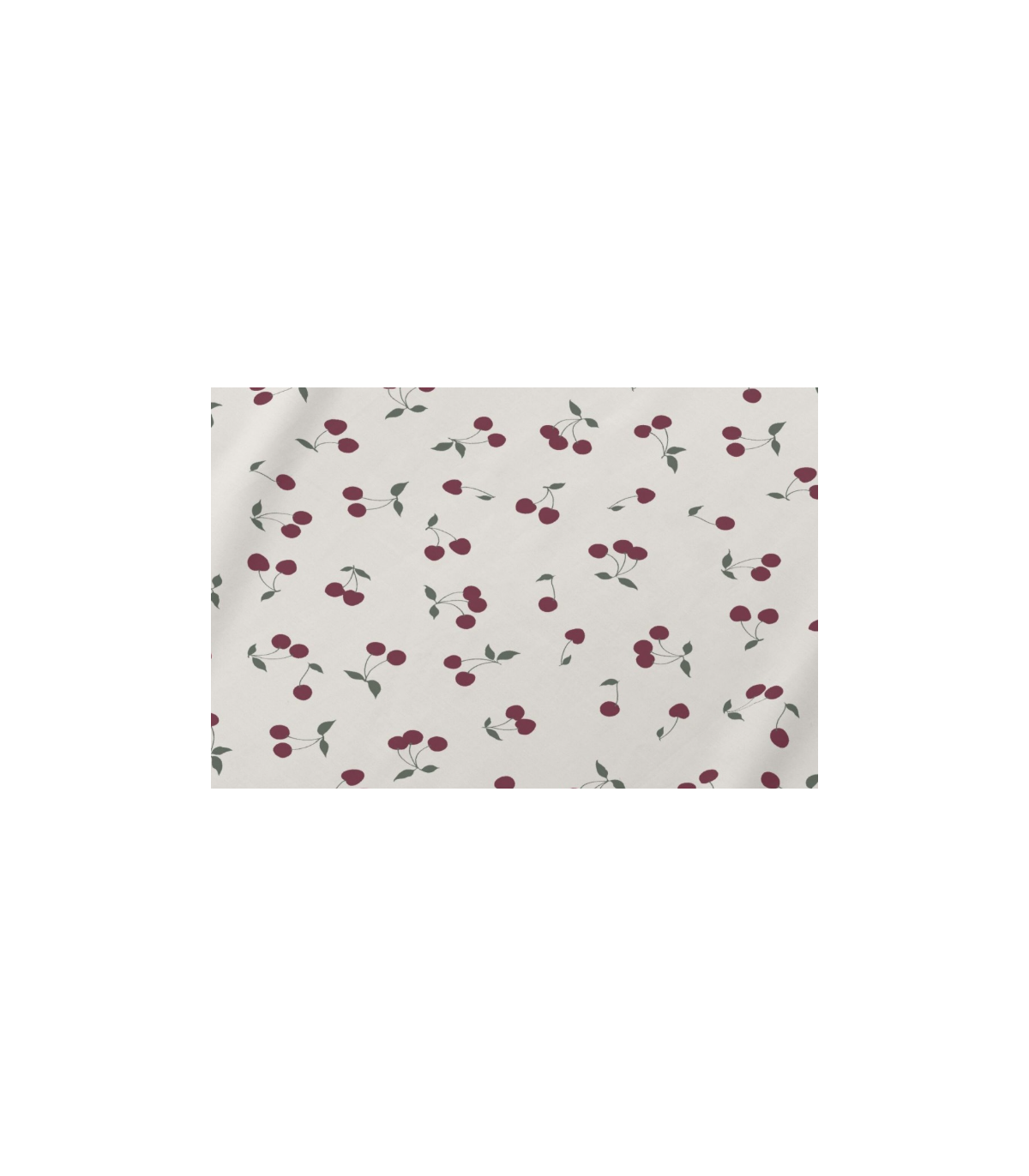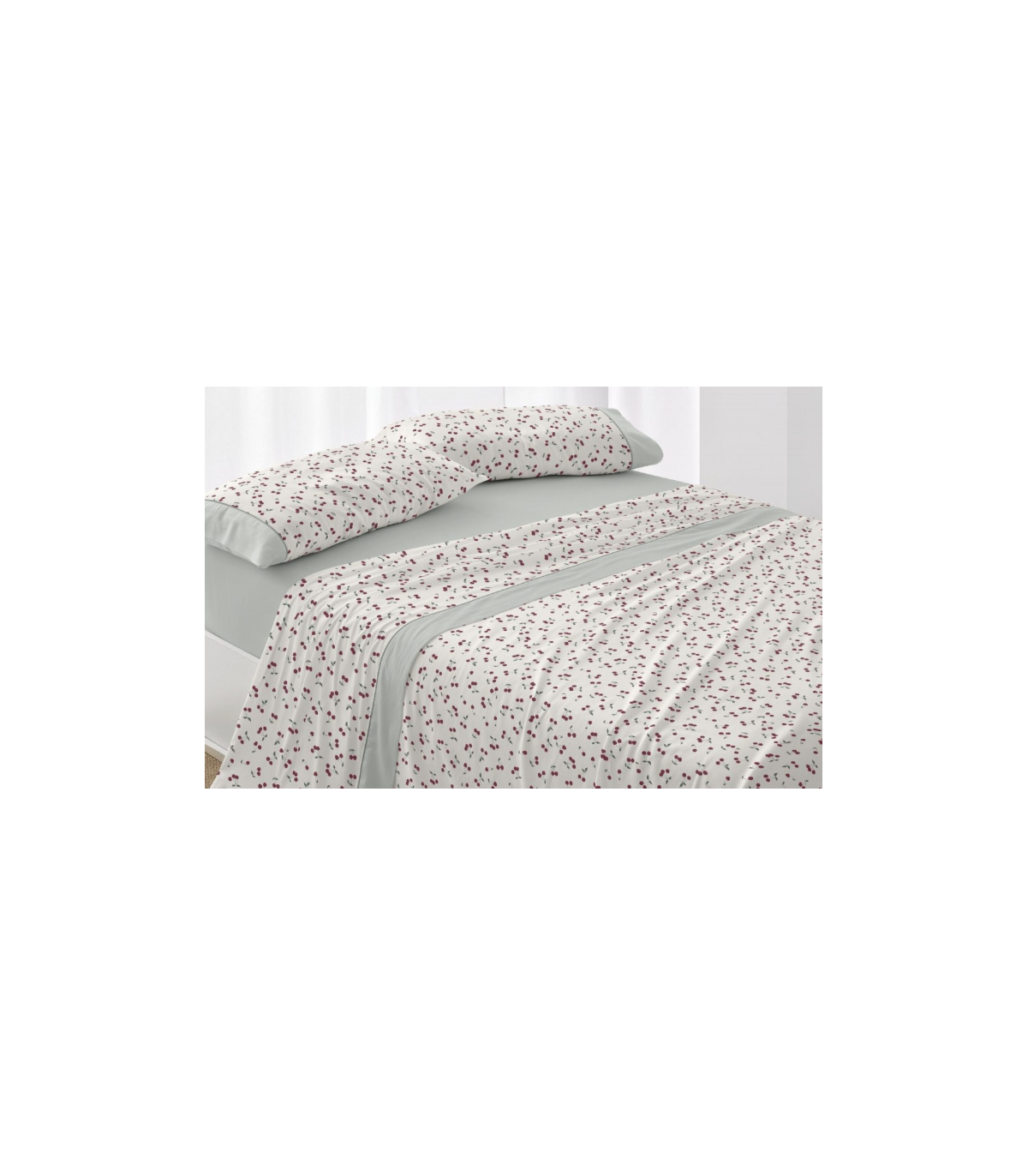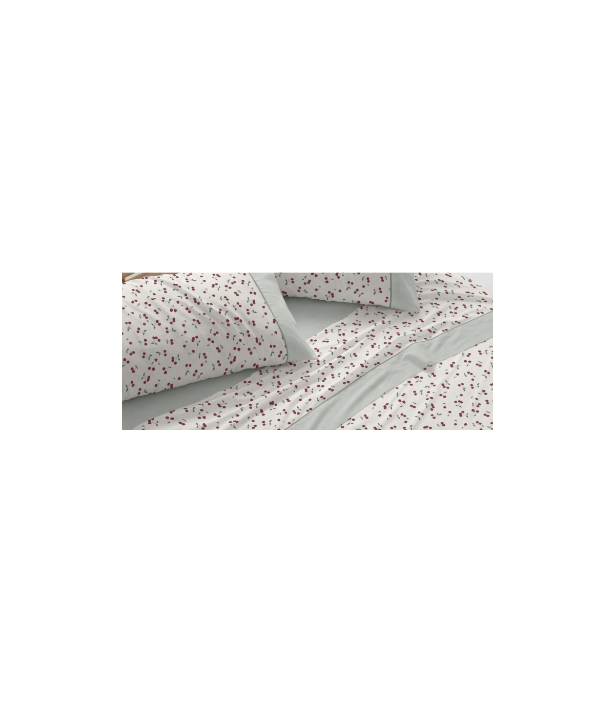 Juego de sábanas de verano diseño frutal, modelo 546 de la marca Burrito Blanco. Juego con un delicado estampado repetitivo de cerezas color cereza y pequeñas hojas en verdes sobre fondo crudo, como una ilustración botánica simplificada con gesto artesanal. La encimera y la funda de almohada repiten el motivo y se rematan con aplicación en verde claro y ribete en verde, aportando un contraste limpio y contemporáneo. Tejido de fácil planchado, gran suavidad y resistencia, pensado para el uso diario y para mantener un aspecto cuidado lavado tras lavado.
